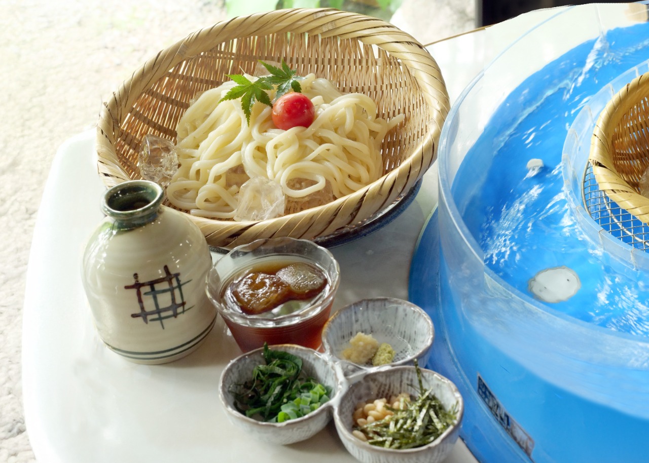 風光明媚な名所として有名な、白水の滝への観光に合わせて、名水茶屋にお立ち寄りいただいております。名水茶屋は、囲炉裏を備えた古民家風の建物が特徴です。炭火焼き御膳(鶏や牛)、名水を使ったそうめんうどん流し、かき氷、コーヒーなどがおすすめです。