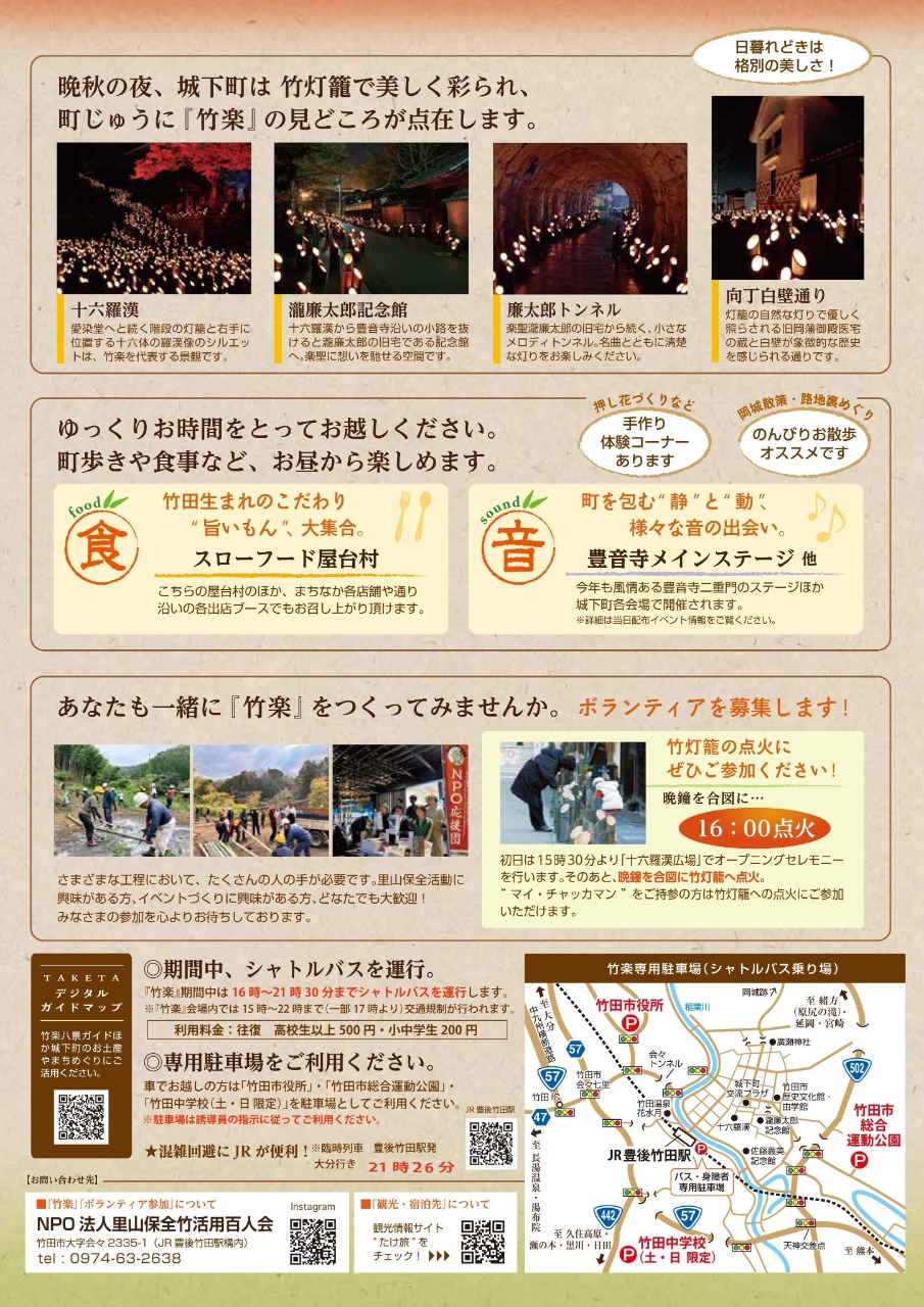 たけた竹灯籠竹楽の会場情報や見どころを、スマートフォンなどからご覧いただけます。