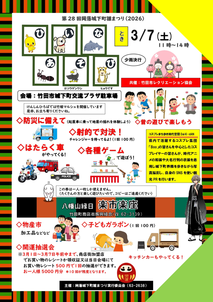 岡藩城下町ひなまつりにあわせて「ひいなあそび・たけ姫マルシェ」を開催いたします。