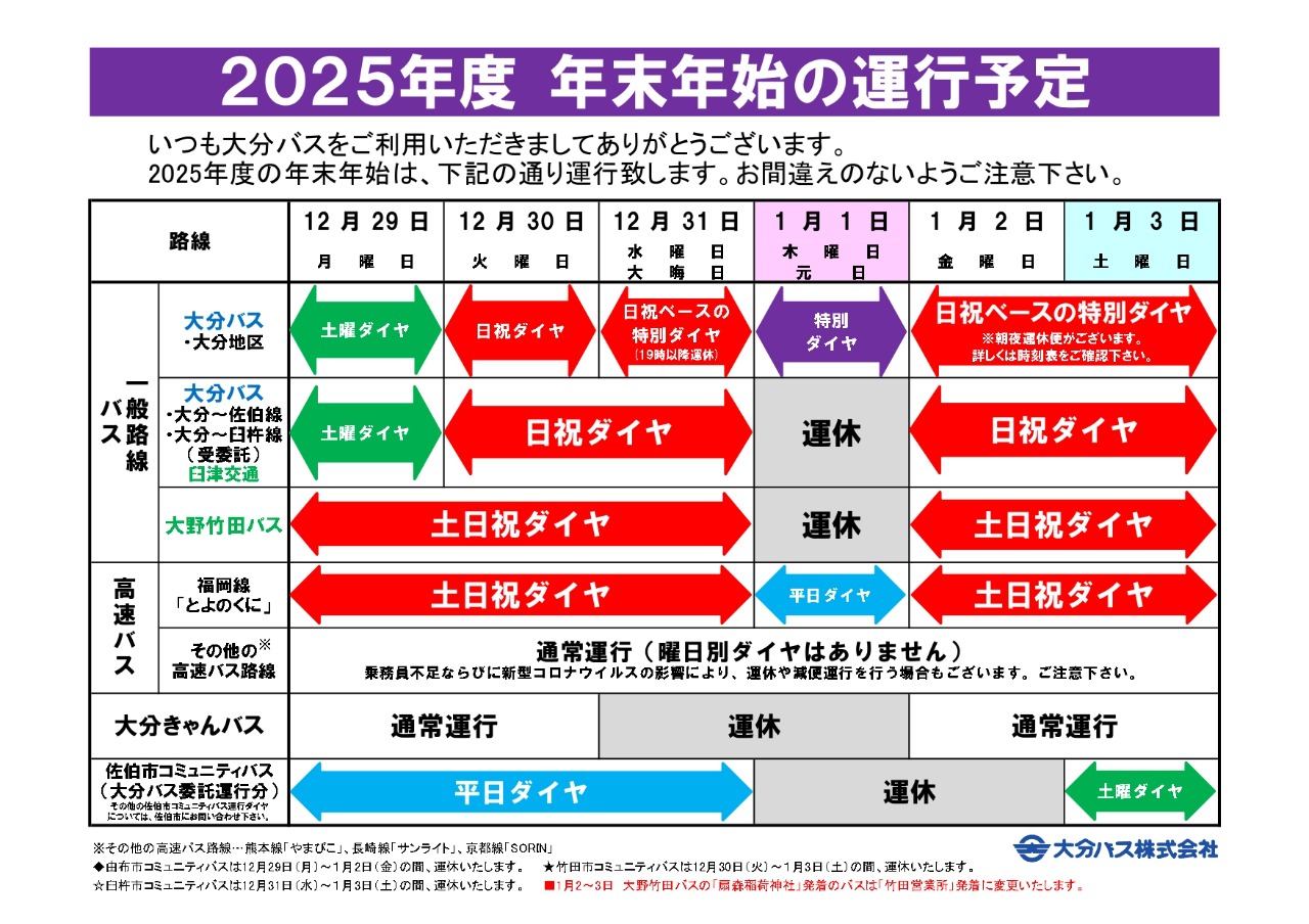 大分バス(大野竹田バス)の年末年始の運行ダイヤについてお知らせいたします。