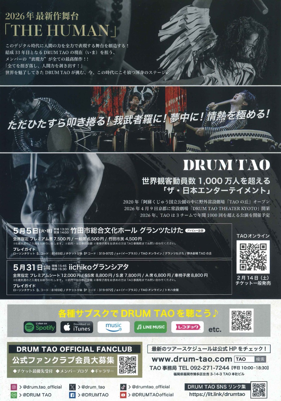 5/5 DRUM TAO 最新作舞台「THE HUMAN」プレビュー公演 城下町・竹田エリア 2026年02月14日 シェア ポスト LINEで送る 開催日時 2026年5月5日(火祝) 開場13:30/開演14:00 ※終演後アフタートークショー実施(16:00~30分) 会場 竹田市総合文化ホール グランツたけた (竹田市玉来1番地1) 入場料 【全席指定】 プレミアム席 7,500円 一般席 6,500円 竹田市民 4,500円 ※前売・当日券同額 ※6歳未満入場不可 チケット取り扱い ローソンチケット(Lコード : 81659)、チケットぴあ(Pコード : 319-972)、イープラス、TAOオンライン、グランツたけた、野外劇場TAOの丘 お問合せ TAO事務局 092-271-7244(平日10:00~18:30) DRUM TAO 2026年最新作舞台 「THE HUMAN」 このデジタル時代に人間の力を全力で表現する舞台を創造する! 結成33年目となるDRUM TAOの現在(いま)を担う、メンバーの“表現力”が全ての最高傑作!! 「全てを削ぎ落とし、人間力を剥き出す!」 世界を魅了してきたDRUM TAOが挑む、今、この時代にこそ放つ渾身のステージ。 「THE HUMAN」チラシデータ(PDF, 1.4MB) DRUM TAO公式Web(外部リンク)