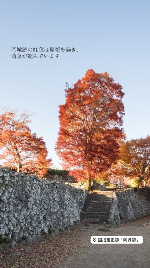 国指定史跡 岡城跡 紅葉情報2025(11/28現在) 城下町・竹田エリア 2025年11月28日 シェア ポスト LINEで送る 岡城跡の紅葉は終盤になりました。 見頃を過ぎ落葉が進んでいます。 (撮影:2025年11月28日)